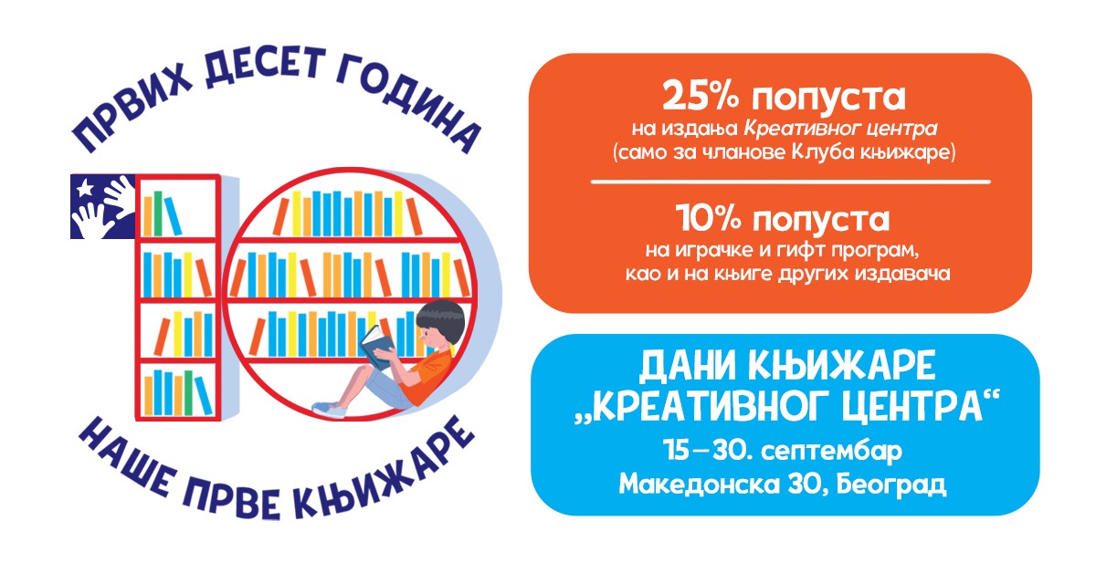 Izdavačka kuća Kreativni centar obeležiće nizom aktivnosti 10 godina rada svoje prve Klub knjižare za decu i mlade, u Beogradu, u Makedonskoj 30.