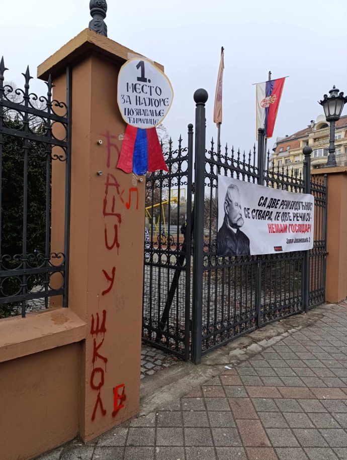 Duhoviti gimanzijalci su dodeli piscu grafita „Prvo mesto za najgore poznavanje ćirilice“, a neko je i „ispravio“ poruku u „Ћалци у школе“.