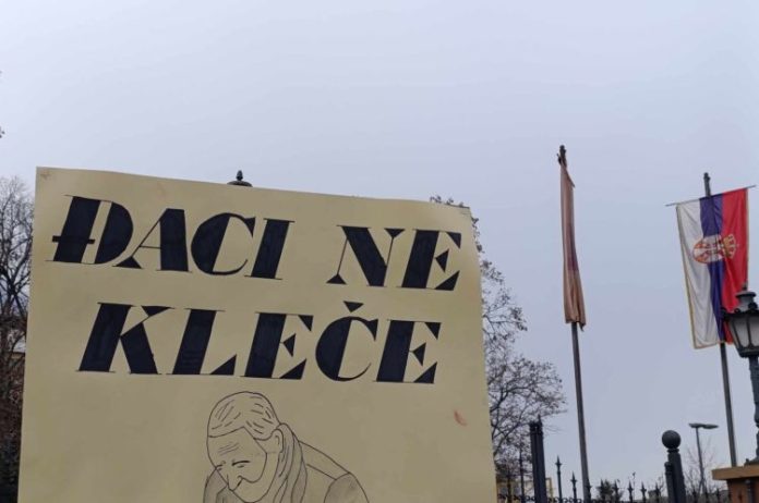 Nosili su transparente na kojoima su poručili da „Đaci ne kleče“, a direktoru: „Razmotrite ostavku“. Time aludiraju na ponašanje direktora Stojkovića prvog dana blokade, 16. decembra, kada je klečao u dvorištu, a potom izjavio medijima da „razmatra“ da li će podržari zahteve svojih đaka.