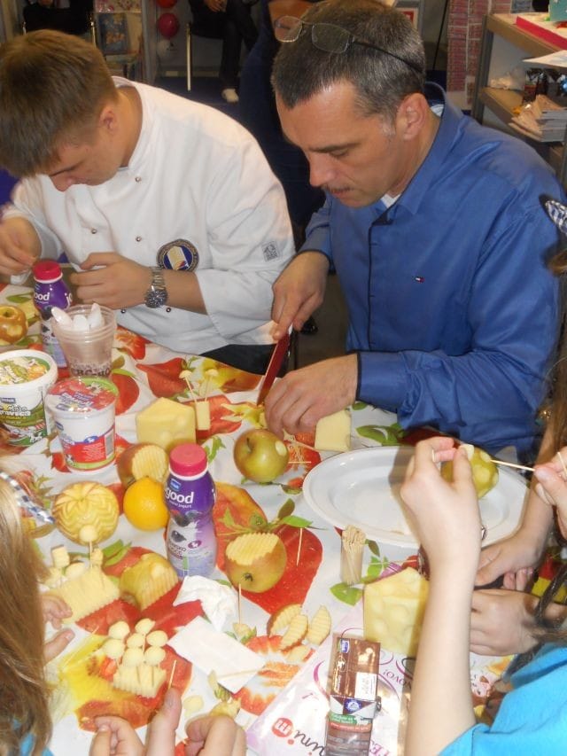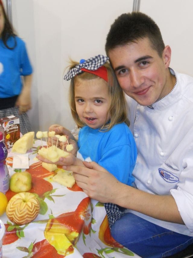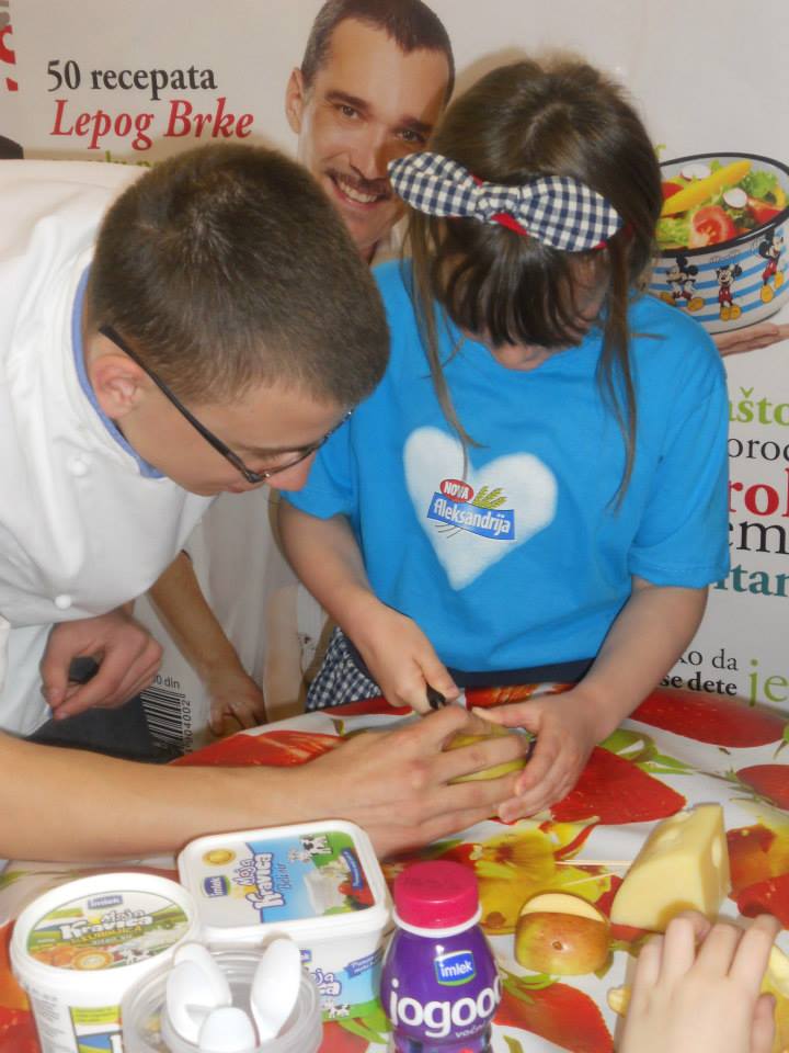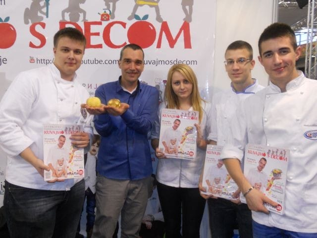 Na štandu časopisa Kuvajmo s decom, smenjivali su se gosti, mali i veliki, kuvarski znalci, ali i naturščici, prijatelji i saradnici. Naš urednik, u svojstvu domaćina, Lepi Brka (Nenad Gladić), sa svojim mladim saradnicima iz Turističko-ugostiteljske škole, Aleksom, Nemanjom, Igorom i Katarinom, sa malim posetiocima našeg štanda, pravili su raznorazne figurice od voća i povrća i kačkavalja.