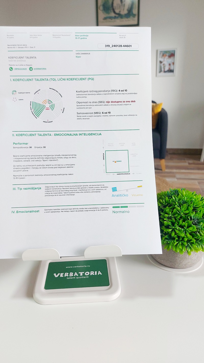 VERBATORIA je vodeća svetska licenca za testiranje talenata. Metod je zasnovan na učenju Howarda Gardnera, njegovoj teoriji o postojanju višestruke inteligencije. Rezultat VERBATORIA testa je „krvna slika“ svake osobe kada je u pitanju način razmišljanja u toku neke aktivnosti kao i koliki potencijal za napredovanje u određenim oblastima rada sa aspekta pažnje i memorije postoji. U kombinaciji sa koeficijentima urođenih talenata i parametrima emocionalne inteligencije (samosvesnost, samopoštovanje, empatija), možete saznati koja je Vaša pozicija u timu, nivo otpornosti na stres i koeficijent procene rizika u novonastalim situacijama.