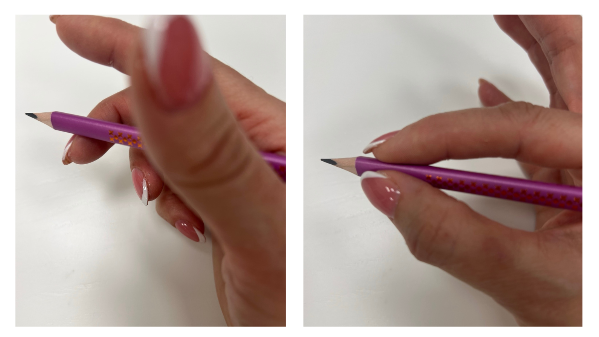 Počnite sa prislanjajem palca i kažiprsta a zatim neka dete nasloni olovku na srednji prst i pravilno zadnji kraj olovke osloni na predeo između palca i kažiprsta.