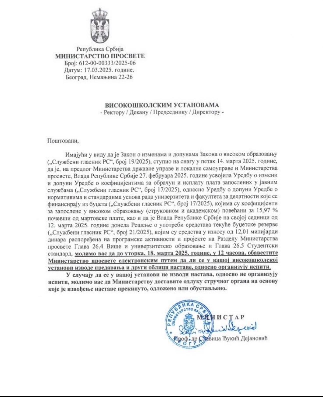 Ministarstvo u dopisu podseća da su 14. marta stupile na snagu izmene Zakona o visokom obrazovanju, da je Vlada 27. februara usvojila uredbu kojoj su koeficijenti za zaposlene u visokom obrazovanju povećani za 15,97 odsto, počevši od martovske plate, kao i da je Vlada obezbedila dodatnih 12,01 milijardi dinara za visoko obrazovanje.
