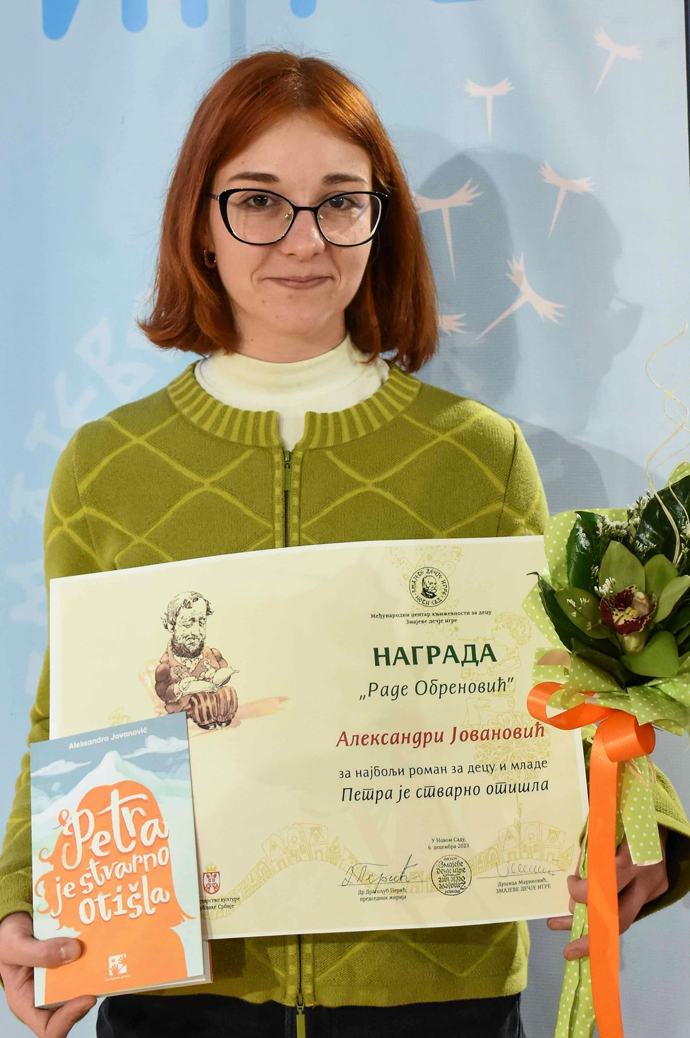 Žiri u sastavu dr Dragoljub Perić, prof. srpske i južnoslovenskih književnosti, Vesna Ćorović Butrić, književnica i dramaturškinja, i dr Milena Zorić Latovljev, prof. srpskog jezika i metodike, proglasio je knjigu „Petra je stvarno otišla“ autorke Aleksandre Jovanović sa ilustracijama Jakše Lakićevića, u izdanju Kreativnog centra, za najbolji roman za decu i mlade u 2023. godini.