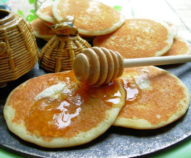 Na tihoj vatri, u tiganju, kratko otopiti puter sa duplo manjom količinom meda. Sipati direktno preko palačinki, i počastiti se bogatim ukusom medenih poslastica.