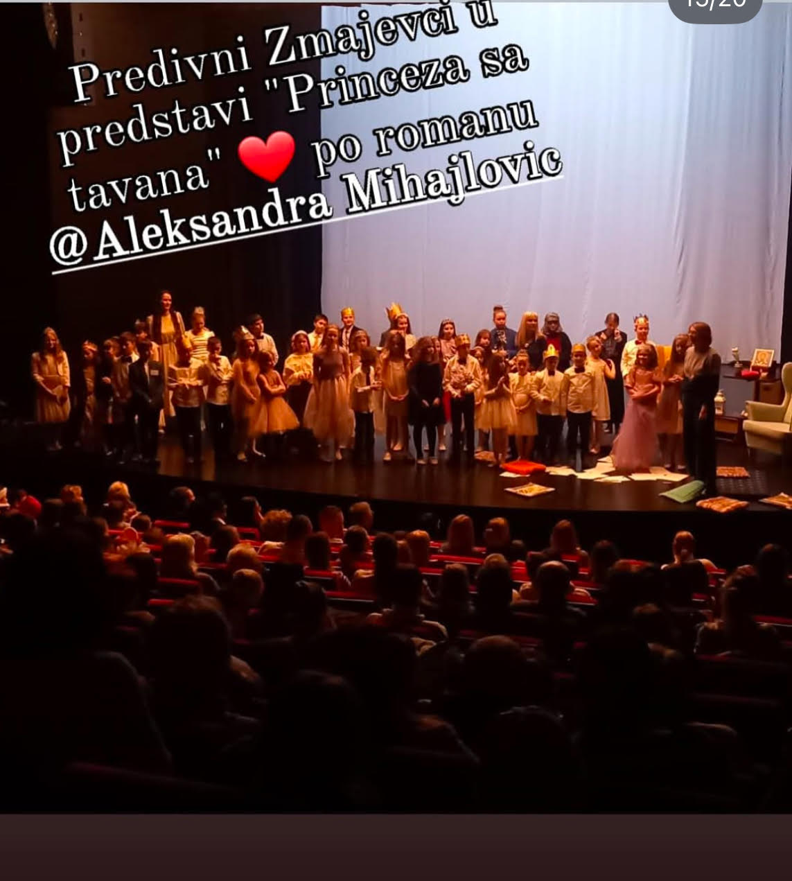 Zbunila sam se. Malo sam čak bila i zakasnila, pa sam tiho ušla u Dom kulture Pančevo, zatečena brojnošću publike (Ovo kao Sava centar, pomislih!). I nisam sve ovo rekla. A bila sam dužna to da kažem kada su me iznenada na scenu pozvali da se kao urednik pomenutog izdanja „Princeza sa tavana“, objavljenog u Službenom glasniku malo pre ovogodišnjeg Sajma knjiga, poklonim pre svega ovoj deci, a potom i svima redom. Na čelu tog reda stoji učiteljica Jelena Vukadinović. Ona je na svoju ruku, sa mnogo razloga očarana Aleksandrinim delom o srednjovekovnim srpskim vladarkama i važnim ženama sa dvora Nemanjića, Lazarevića i Brankovića, odlučila da sačini mini-predstavu. Mini-predstava obuhvatila je 45-oro dece koja su scenom vladala kao da već imaju ozbiljan pozorišni opus.