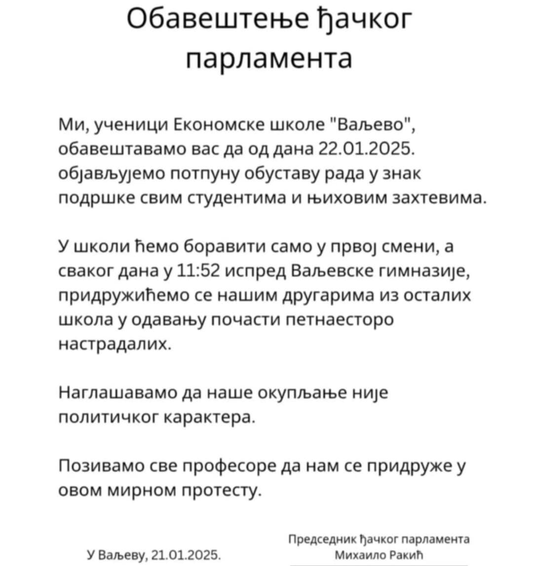 „U školi ćemo boraviti samo u prvoj smeni , a u 11.52h ispred Valjevske gimnazije pridružićemo se našim drugarima iz ostalih škola u odavanju počasti petnaestoro nastradalih . Naglašavamo da naše okupljanje nije političkog karaktera. Pozivamo sve profesore da nam se pridruže u ovom mirnom protestu“, navodi se u saopštenju Djačkog parlamenta Ekonomske škole.