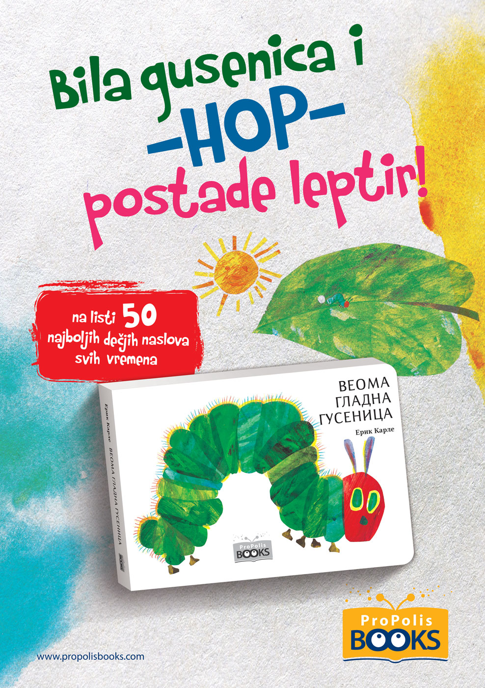 Bio jednom jedan dečji pisac koji se u dokolici igrao bušačem za papir. Rupe su ga podsetile na crva, crv na knjiškog crva i rodio se Vili crv. Ali urednica ovog pisca bila je mišljenja da zeleni crv nije dopadljivi protagonista, pa je predložila gusenicu. A pisac je uzviknuo:“Leptir!“ i tako je sve počelo! Četrdeset šest godina i trideset miliona prodatih primeraka kasnije, izdavačka kuća ProPolis Buks objavila je knjigu „Veoma gladna gusenica“ Erika Karla na srpskom jeziku. Nalazi se na listi 50 najboljih dečjih naslova svih vremena!